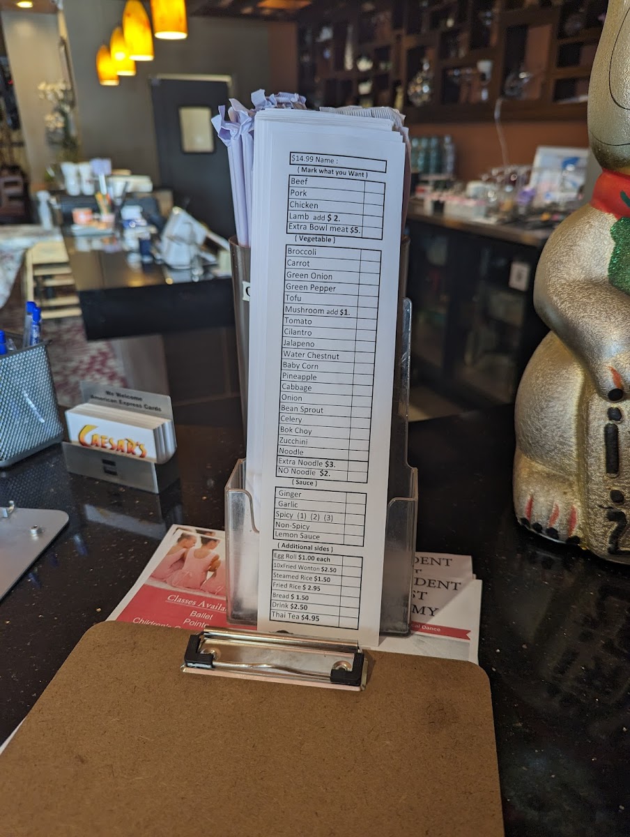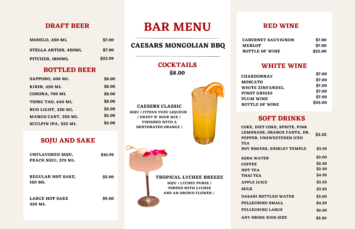 At Caesar's Mongolian Bar-B-Q, you're in for a flavorful, customizable dining experience that puts you in control. Situated at 11803 Del Amo Blvd, Cerritos, CA, this spot offers a unique twist on traditional Mongolian BBQ. The menu invites you to create your own perfect bowl, with a wide selection of fresh ingredients including vegetables, meats, and noodles. Once you've chosen your favorites, the chefs prepare it right before your eyes on a sizzling hot grill. With a variety of sauces and spices to choose from, every dish can be tailored to your taste, whether you're craving something mild or looking for a spicy kick. It’s not just a meal; it’s a fun and interactive experience where you get to enjoy fresh, sizzling flavors, all served in a relaxed and friendly atmosphere. Whether you’re visiting for lunch or dinner, Caesar's Mongolian Bar-B-Q Menu promises a satisfying and vibrant meal that keeps you coming back for more.